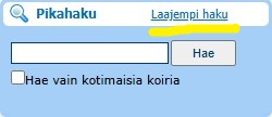 VAIHE 2. Avaa KoiraNet aloitussivun Pikahaku oikealta puolelta toiseen selaimeen tai kuten tässä uudelle välilehdelle Laajempi haku linkki.