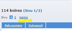 Valitse listan ylälaidassa olevasta Kaikki linkistä näkymäksi kaikki koirat. Sivulla olevien uroksien tiedot näkyvät listalla aakkosjärjestyksessä. Voit nyt joko tulostaa listan (avaa valikko hiiren oikealla painikkeella ja valitse tulosta) tai kopioida ja tallentaa omalle tietokoneellesi taulukoksi esim. Exceliin.
