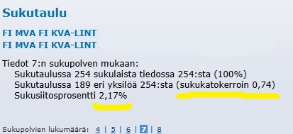 VAIHE 4. Ota jatkokäsittelyyn kaikki ne yhdistelmät, joiden sukukatokertoimen arvo on 0,70 tai suurempi laskettaessa KoiraNet sukupolven lukumäärä 7 mukaan.